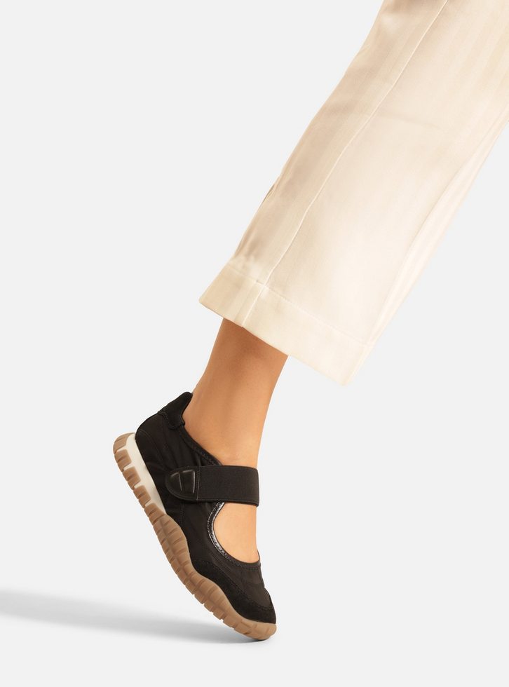 Tênis feminino preto em couro, suede e nylon. O sapato tem sola baixa, esportiva, emborrachada e bege, com relevo riscado e irregular. Traz cabedal aberto na parte superior do pé e costuras pesponto. Com formato arredondado na ponta, o tênis tem fecho em tira elástica larga com velcro e ponteira.