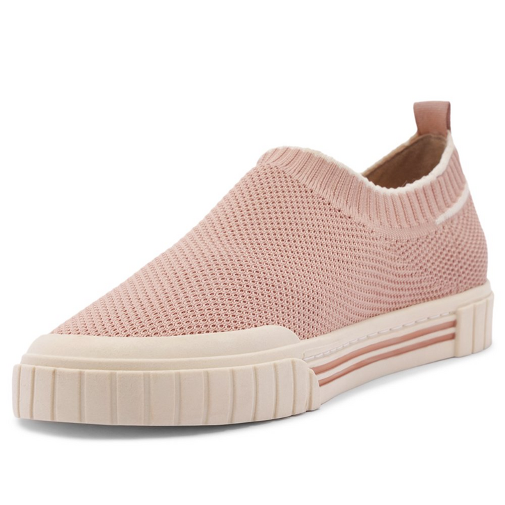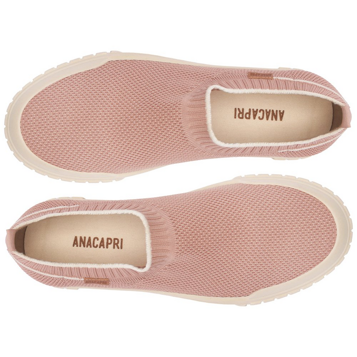 Tênis slip on Alê em knit rosa. O modelo possui biqueira emborrachada texturizada e solado baixo emborrachado branco com detalhe em duas listras rosa na lateral. Com corpo em knit brilhoso - tecido que se ajusta como uma meia no pé com detalhe em brilhos por todo o cabedal. Vem com fita em gorgurão de mesmo tom aplicada na parte traseira, facilitando o calce. Com tag lateral em tecido marrom, com assinatura Anacapri.