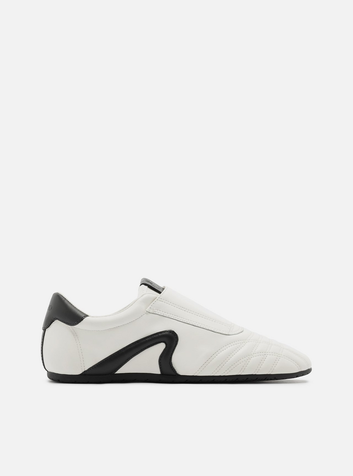 Tênis feminino branco de couro. O sapato tem sola baixa emborrachada, flat e preta. Traz costuras na parte frontal e aplicação em couro preto no calcanhar e laterais. Com formato arredondado na ponta, o tênis tem aplicação em couro sobre a lingueta, que facilita o calce, e tag do nome da marca na língua.