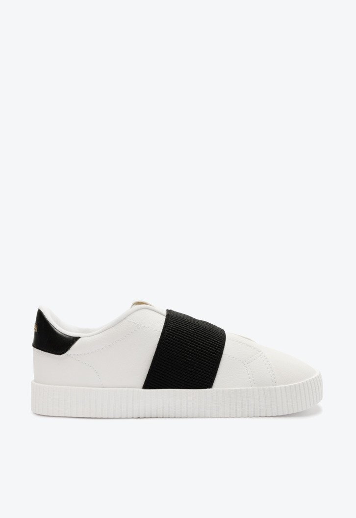 Tênis Anacapri slip on branco com elástico preto. O modelo sem cadarços vem para a temporada com construção nova de solado - traz sola robusta baixa emborrachada vulcanizada branca. De material similar a couro, traz detalhe de costura em pesponto delicado por todo o cabedal e aplicação de faixa larga elástica preta, na horizontal. Aplicação de pin metálico na peça traseira com assinatura Anacapri.