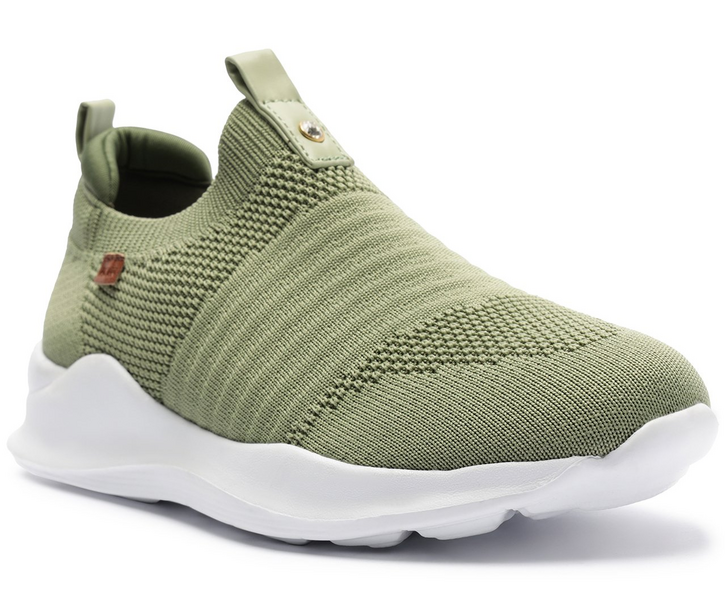 Slip on de knit verde. Possui texturas na gáspea, solado branco tratorado e detalhe de aplicação de alça na lingueta e no calcanhar para facilitar o calce. Tag marrom lateral com o nome da marca.