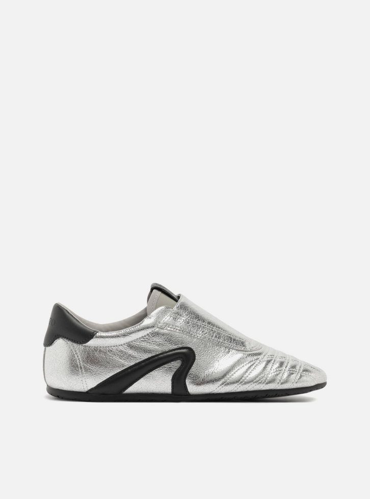 Tênis feminino metalizado prateado de couro. O sapato tem sola baixa emborrachada, flat e preta. Traz costuras na parte frontal e aplicação em couro preto no calcanhar e laterais. Com formato arredondado na ponta, o tênis tem aplicação em couro sobre a lingueta, que facilita o calce, e tag do nome da marca na língua.