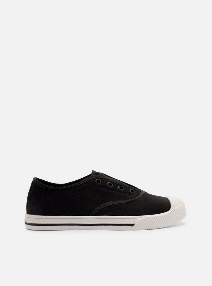 Tênis slip on preto em lona. O sapato tem solado baixo emborrachado branco, com frente texturizada e risca lateral preta. De formato arredondado na ponta, traz aplicação de ilhós decorativos na parte superior e elástico sobre a parte superior, que facilita o calce. Com palmilha macia e inscrição do nome da marca.