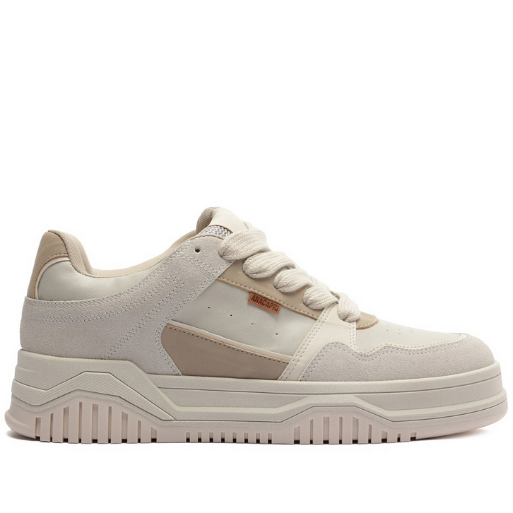 Tênis Sofi, com detalhe em recortes, em cinza e bege. O modelo apresenta nova construção no solado - mais alto e estruturado, traz sola flatform emborrachada em branco com detalhe tratorado marrom. Com um design robusto com aplicação de mix de peças em napa e camurça coloridas e recortadas por todo o cabedal. Possui acabamentos em costura pesponto nos contornos e perfuros na lateral e na biqueira, proporcionando maior respirabilidade para o tênis. De amarrar, com atacadores brancos. Aplicação de tag marrom lateral Anacapri.