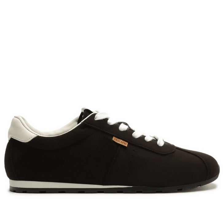 Tênis Sporty Olívia, na cor preta. De solado baixo emborrachado em goma vulcanizada e tratorada marrom, com detalhe traseiro em branco. O modelo apresenta design de costura pesponto nas laterais e contornos, com efeito pontilhado e perfuros delicados na diagonal das laterais. Apresenta cabedal em camurça, com aplicação de peça traseira em napa branco. De amarrar, com atacadores brancos, possui parte interna forrada branca. Com aplicação de tag lateral marrom e etiqueta tecida na lingueta, ambas com assinatura Anacapri.