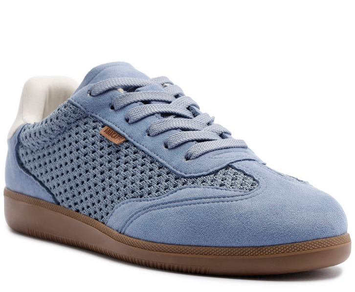 Tênis Ana, com efeito tramado, na cor azul. De solado baixo emborrachado em goma vulcanizada, o modelo apresenta design de costura pesponto nas laterais e contornos, com recortes em peças em camurça e napa marrom aplicados na biqueira e na parte traseira. Detalhe para lateral vazada com efeito tramado, com perfuros delicados. De amarrar, com atacadores no mesmo tom do tênis, possui parte interna forrada branca. Com aplicação de tag lateral marrom Anacapri.