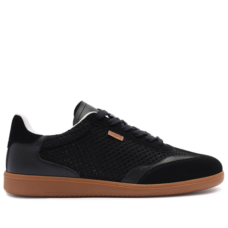 Tênis Ana, com efeito tramado, na cor preta. De solado baixo emborrachado em goma vulcanizada, o modelo apresenta design de costura pesponto nas laterais e contornos, com recortes em peças em camurça e napa preto aplicados na biqueira e na parte traseira. Detalhe para lateral vazada com efeito tramado, com perfuros delicados. De amarrar, com atacadores no mesmo tom do tênis, possui parte interna forrada branca. Com aplicação de tag lateral marrom Anacapri.