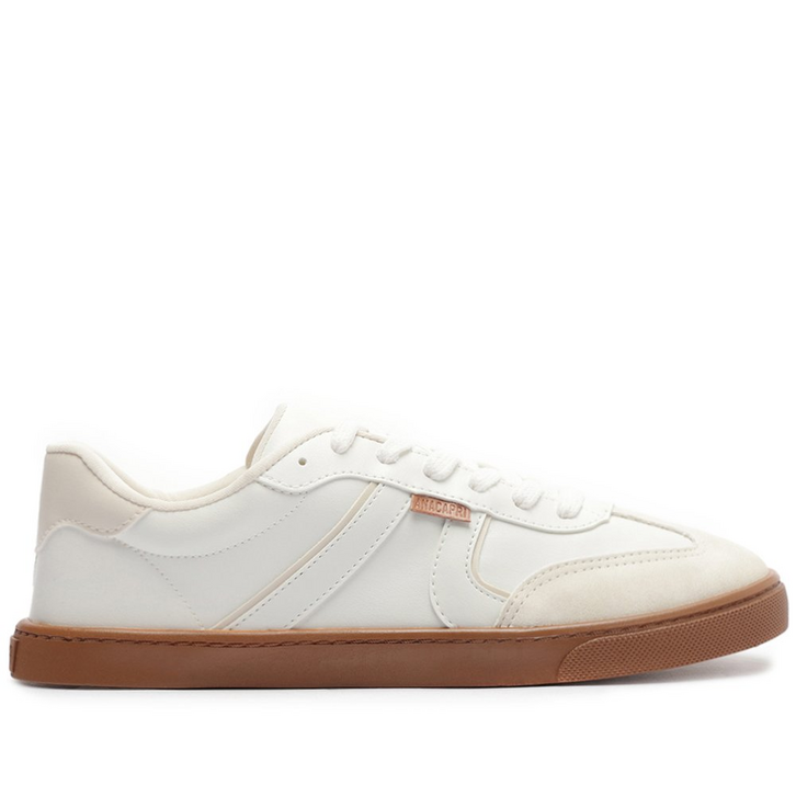 Tênis chuteira com solado de goma e detalhe em listras, em branco e bege. De solado baixo emborrachado em goma marrom vulcanizada, o modelo apresenta cabedal com detalhe de costura pesponto nas laterais e contornos, com design de recortes na biqueira, na parte traseira e na lingueta, em mix de materiais em napa e camurça, nos tons de bege e branco. De amarrar, com atacadores brancos, possui parte interna forrada colorida. Com aplicação de peças recortadas com design em listras assimétricas na lateral do tênis e tag Anacapri.