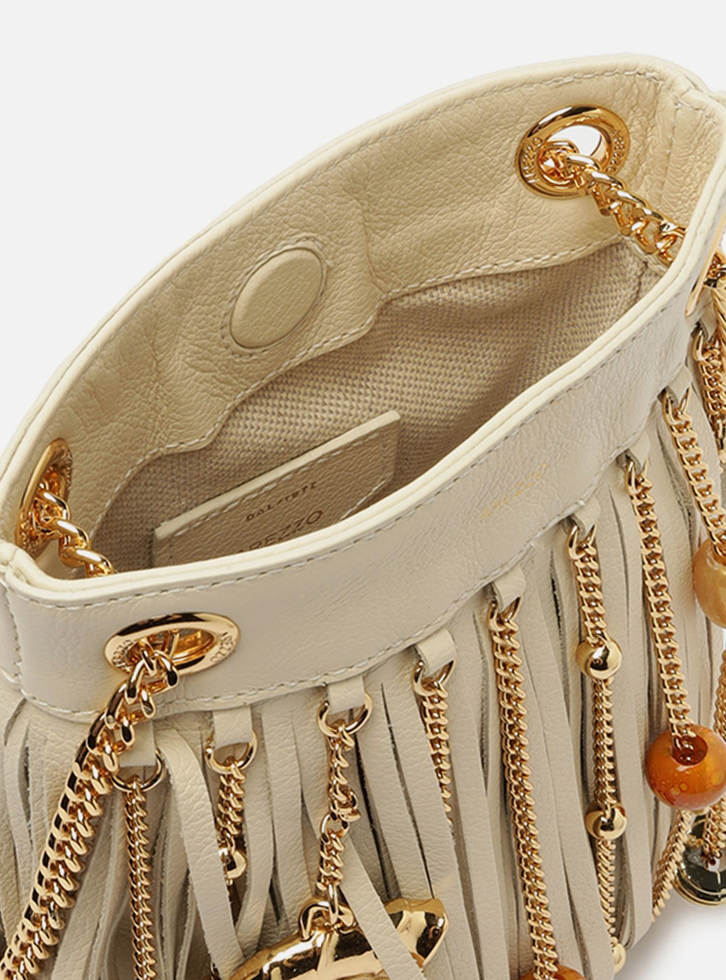 Bolsa tiracolo pequena de couro branca. O acessório tem formato compacto, franjas em couro sobre as capas e correntes com aplicações de pedrarias resinadas e metal em forma de concha. Traz alça lateral em corrente metálica.