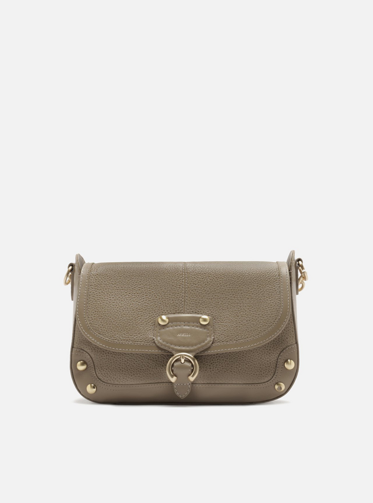 Bolsa tiracolo média cinza de couro com efeito desgastado. O acessório tem formato estruturado com laterais arredondadas. Traz alça lateral regulável em couro e corrente metálica dourada, com detalhe em pedras. Possui fecho em tampo frontal com imã interno e detalhe em tira com argola metálica vazada.
