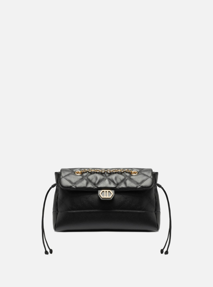 Bolsa tiracolo média preta de couro. O acessório tem formato estruturado e acabamento macio com costuras em matelassê. Traz alça lateral em corrente metálica com ombreira de couro, presa por ilhoses na parte superior. Possui fecho em tampo frontal com aplicação de peça metálica geométrica e vazada. Com detalhe em tiras finas nas laterais.