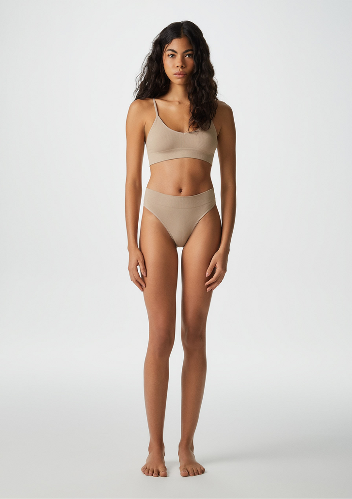 Top básico sem costura em malha de poliamida e elastano com textura canelada e toque macio. Top sem bojo e sem abertura na parte de trás. Conta com um decote frente em V, um pouco mais arredondado, decote costas reto e alças com reguladores.