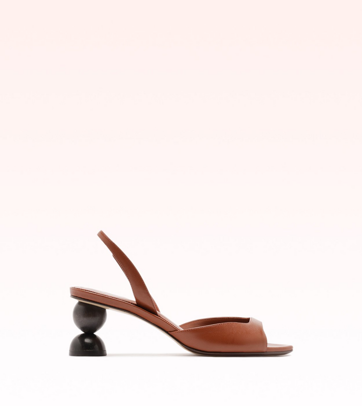 A sandália Tropicana 50 une design slingback e cabedal clássico a um salto escultural em madeira, formado por duas esferas de tamanhos distintos. O contraste entre as curvas suaves e o salto natural cria um visual leve e arquitetônico. Detalhes como o recorte picotado na taloneira reforçam o acabamento artesanal, resultando em uma peça feminina, elegante e repleta de personalidade.