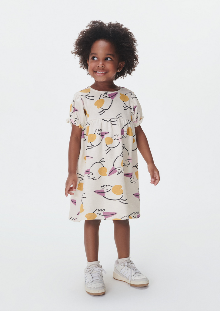 Vestido estampado com manga bufante. Conta com cavas levemente deslocadas, abertura em gota e elástico na saída das mangas. Desenvolvido em malha texturizada de algodão. Características da peça:Malha texturizada