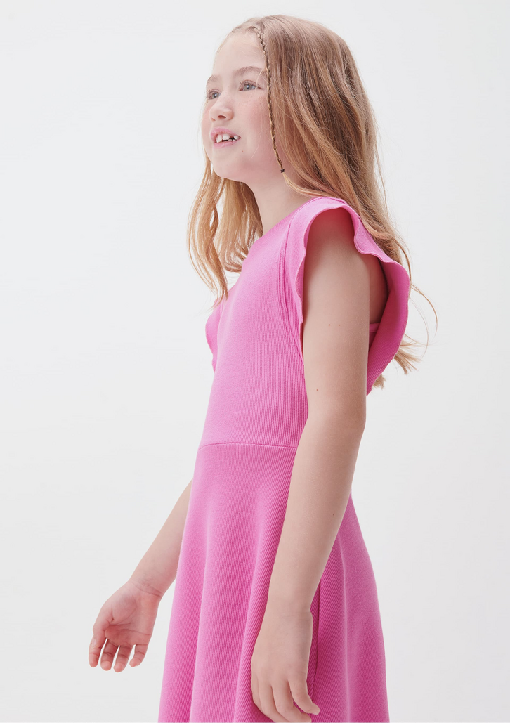 Vestido infantil confeccionado em meia malha de ribana de algodão liso. O modelo é sem manga com babados aplicados nas laterais, recorte horizontal e saia rodada com comprimento curto.Detalhes da peça:Ribana canelada Comprimento curto Sem manga com babados Saia rodada Recorte horizontal Gola redonda